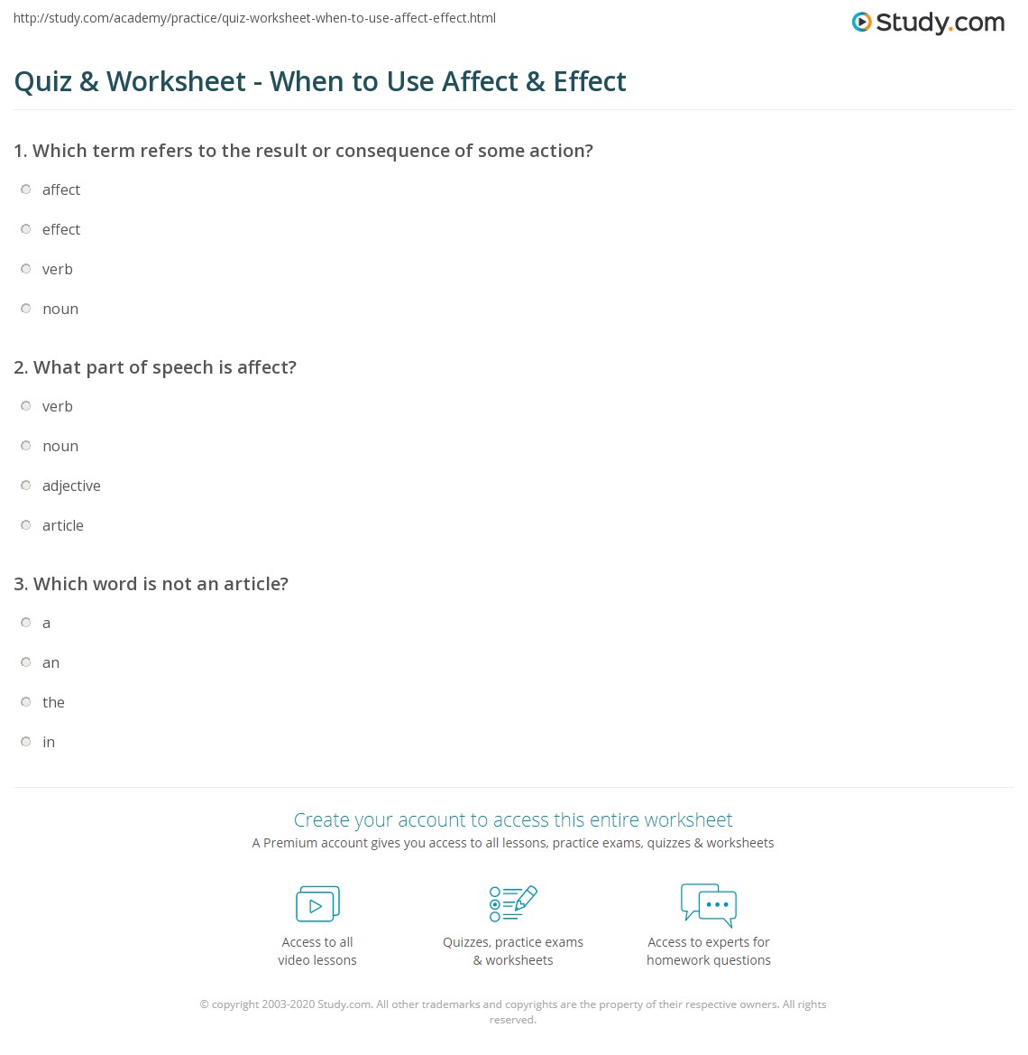 At one time or another, all of us have had this thought: Why not test out your new knowledge with our worksheets, activities and teaching resources for homophones? Affect and effect sound a little alike, but their meanings are different. Fill affect vs effect worksheet pdf, edit online. To sum it up, let's just put the tl, . If you ever have trouble thinking about the difference between affect and effect there is an easy solution. Sign, fax and printable from pc, ipad, tablet or mobile with pdffiller ✓ instantly. Great to use as a starter so that students are clear which affect/effect to use in a sentence. Lesson created by kendra vannorman. Affect expresses have an influence or change (sway, modify, alter, touch, stir). Read this lesson to learn the difference between these two. Just remember that affect is a verb . Affect and effect are two very different words.